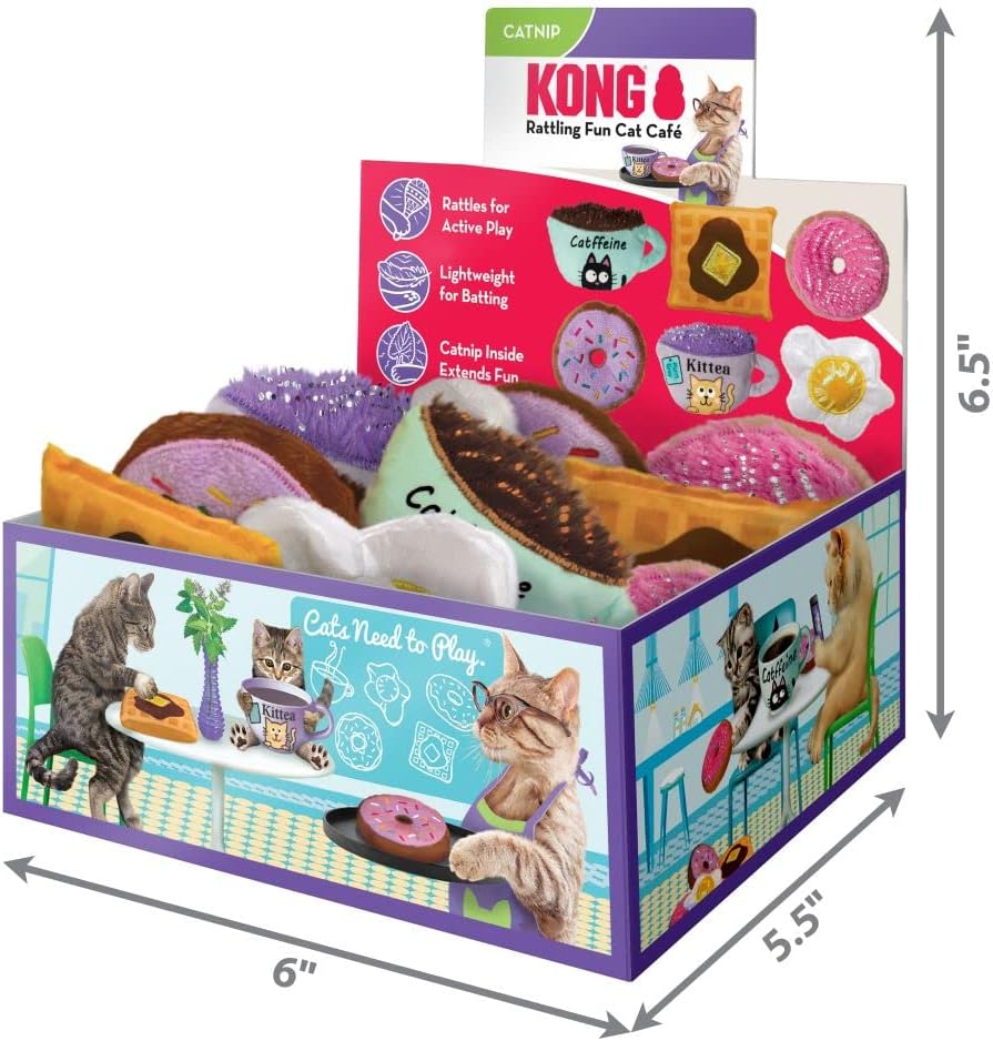 KONG Scrattles box of kitty toys offers an irresistible menu of rattling fun for cats hungry for batting and pouncing play. Breakfast is always served to-go with lightweight, small toys ideal for chasing and capturing, satisfying natural hunting instincts. At Kitty Café, there’s a range of adorable entrees, but everything comes in one flavor—KONG North American Premium Catnip. It’s packed in every toy along with a rattle that extends the fun.
