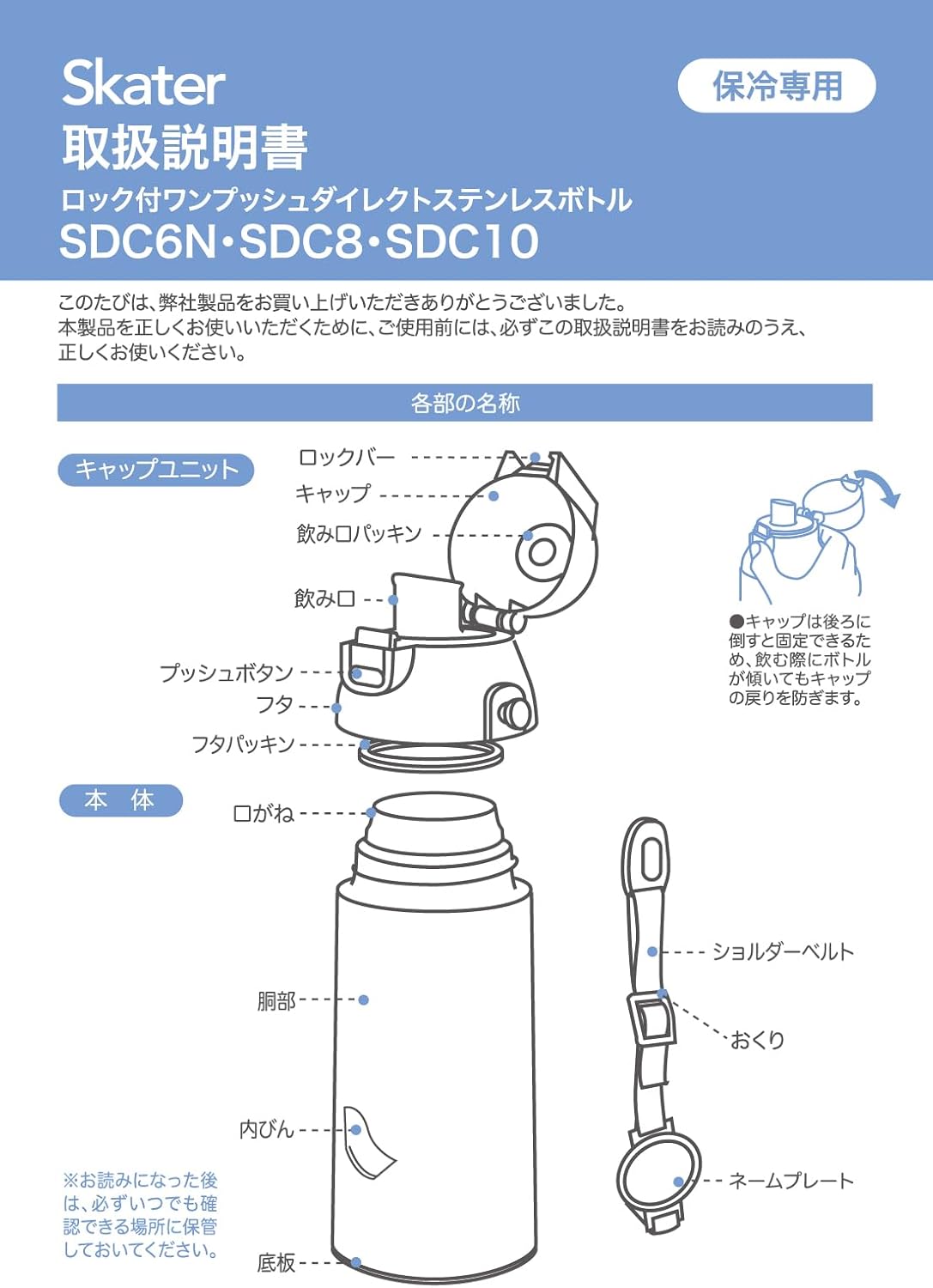 Stainless steel bottle for easy drinking with one touch. Cap lock design keeps the cap from falling down even when you tilt the bottle. The shoulder strap has a name plate, perfect for kindergarten and school. Cold Retention: Below 16.4°F (8°C) (6 hours) Do not fill with hot beverages. Please do not use in microwave, dishwasher, or dryer.
